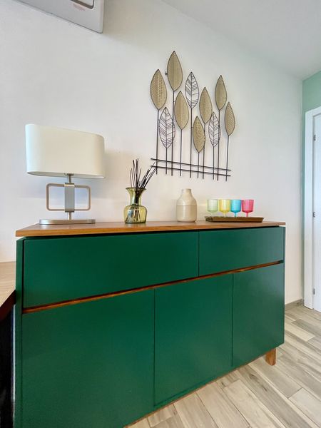 Cocina integral con gabinetes, parrilla eléctrica y refrigerador